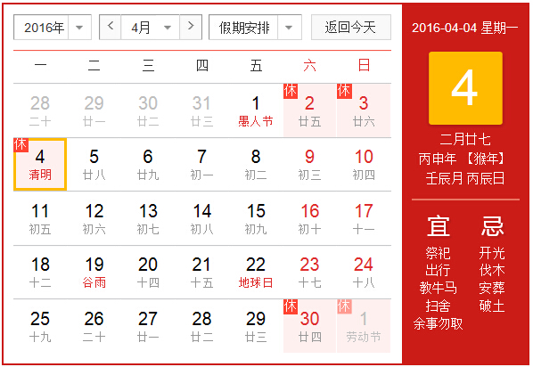 2016清明節(jié)放假時:201642——44周六、周日、周一共三天
