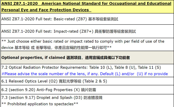例如7.2.2 Protection Against High-Speed Particles(F/B/A)高速撞擊&7.2.8 Lateral Protection側(cè)向防護(hù),這個(gè)標(biāo)準(zhǔn)對(duì)應(yīng)撞擊的等級(jí)是由眼面部防護(hù)用品防護(hù)部位和性能決定的,可參考表7: