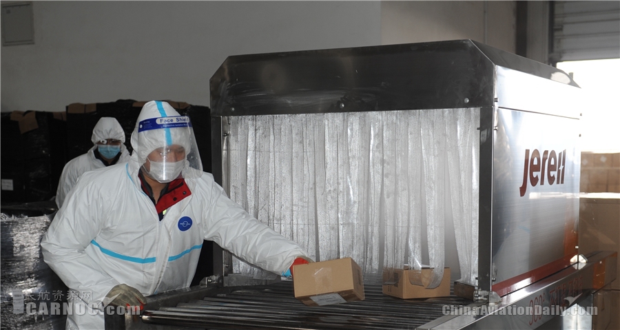 圖:工作人員用靜電噴霧消毒箱為入境貨物進(jìn)行消毒 機(jī)場(chǎng)供圖